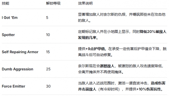 仇恨控制:I Got 'Em 和 Dumb Aggression 确保了奈尔斯能牢牢吸引住敌人的火力,有效保护你和另一名同伴。Dumb Aggression 更是能打乱敌人的阵型,将他们暴露在你的枪口下。