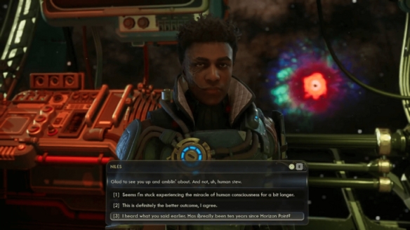 探索完毕后,前往飞船的驾驶舱与奈尔斯交谈。他会告诉你关于叛徒奥古斯丁·德弗里斯的情报,并商讨下一步行动计划。这里的对话选项不会对任务产生重大影响,你可以放心询问详情。