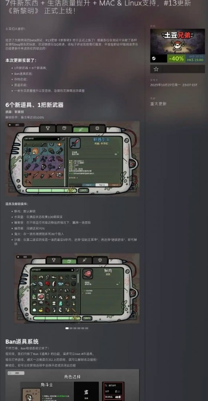 《土豆兄弟》“新黎明”更新上线,实用功能扎堆来!Ban道具系统解决了流派成型的痛点,图鉴系统堪称“游戏百科”,记录道具、敌人信息与游玩进度。3个存档栏位满足多场景需求,新武器“斩首剑”和6个特色道具带来新鲜感。还优化了数值图标、合并了通知图标,Mac和Linux平台也能原生体验。