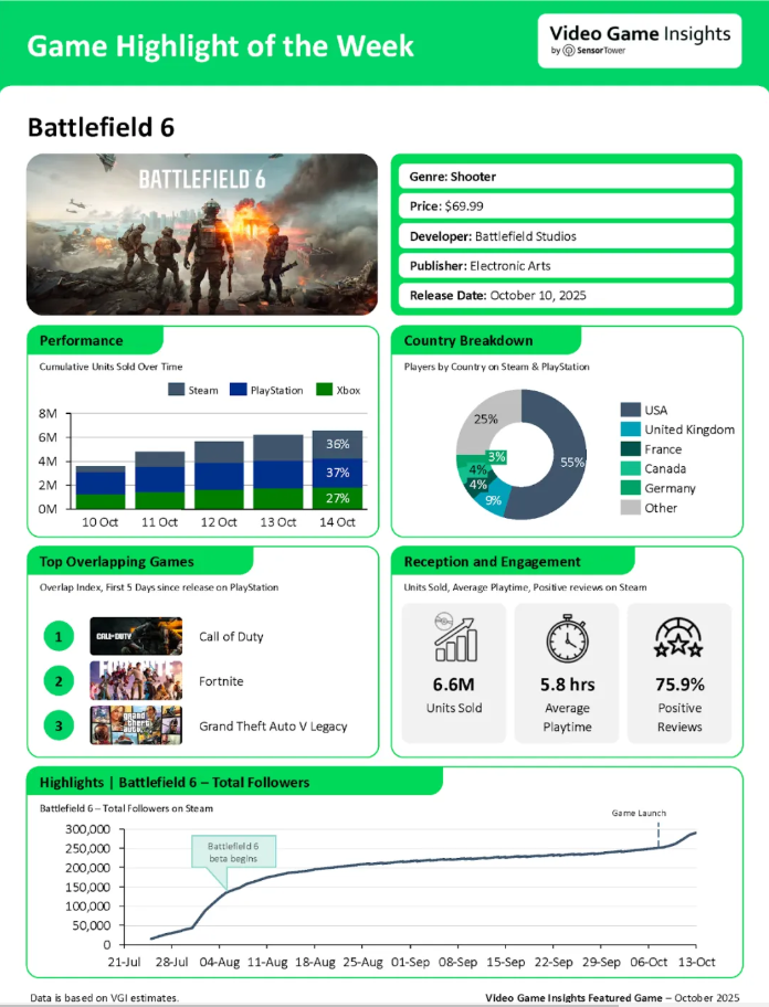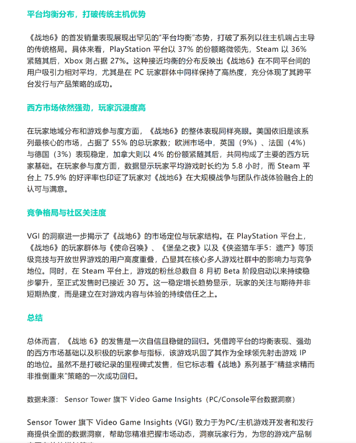 根据Sensor Tower旗下Video Game Insights (VGI) PC/主机平台数据洞察的最新数据,《战地6》首发5天,PC/主机平台总销量大约660万套,“为系列续作的稳步发展奠定了坚实基础”。