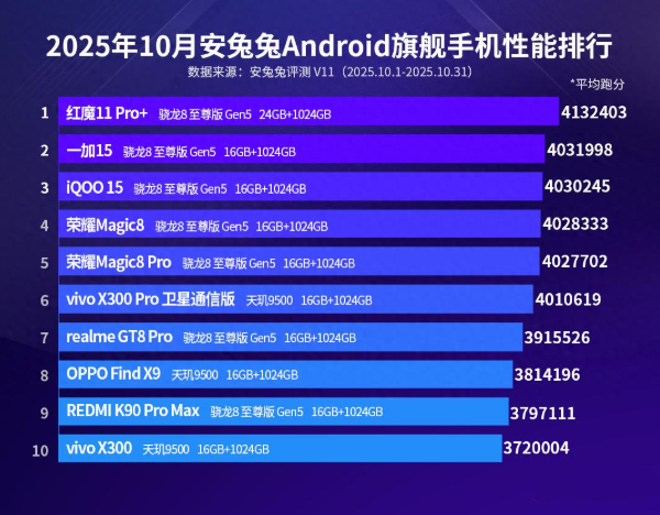 安兔兔已公布 2025 年安卓手机性能排行榜,随着第五代骁龙 8 至尊版与天玑 9500 芯片的全面登场,榜单迎来大洗牌。旗舰机型跑分普遍突破 400 万大关,游戏手机凭借专属散热与优化占据前列,部分天玑机型也凭借能效优势跻身榜单。这份榜单不仅展现了硬件性能的巅峰水准,更折射出厂商优化能力的差异,为性能党选购提供了核心参考。