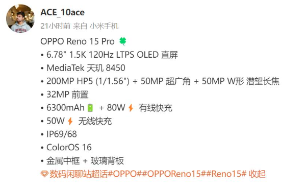 此外,OPPO Reno 15系列预计年底前在国内发布,2026年初登陆全球市场。 那么综上信息所述,大家对新机有什么期待吗?一起来说说看吧。