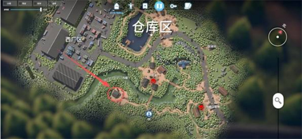 1、前往仓库区地图,定位在沟壑南方的独栋小屋。